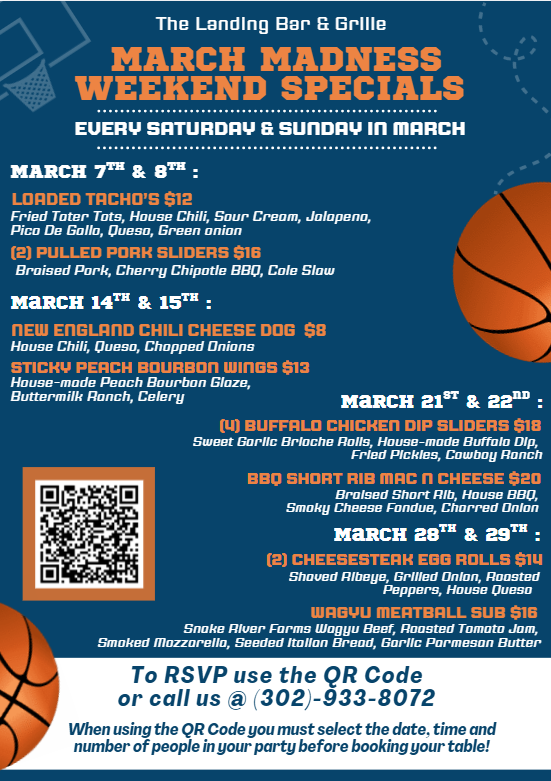 Catch all the March Madness action at The Landing with food and drink specials every Saturday and Sunday in March. Bring your friends, grab a seat, and enjoy game-day favorites, cold drinks, and a high-energy atmosphere all tournament long. Whether you’re cheering for your bracket or just here for the bites, The Landing is your headquarters for March hoops every weekend.