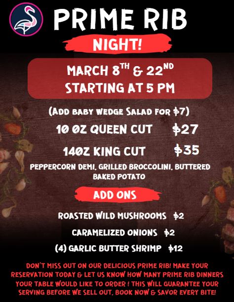 Join us at The Landing for Prime Rib Night and enjoy a perfectly seasoned, slow-roasted prime rib served just the way you like it. Tender, flavorful, and carved to order, it’s the kind of dinner that turns an ordinary night into something special. Bring your appetite and settle in for an evening of great food and great company at The Landing.