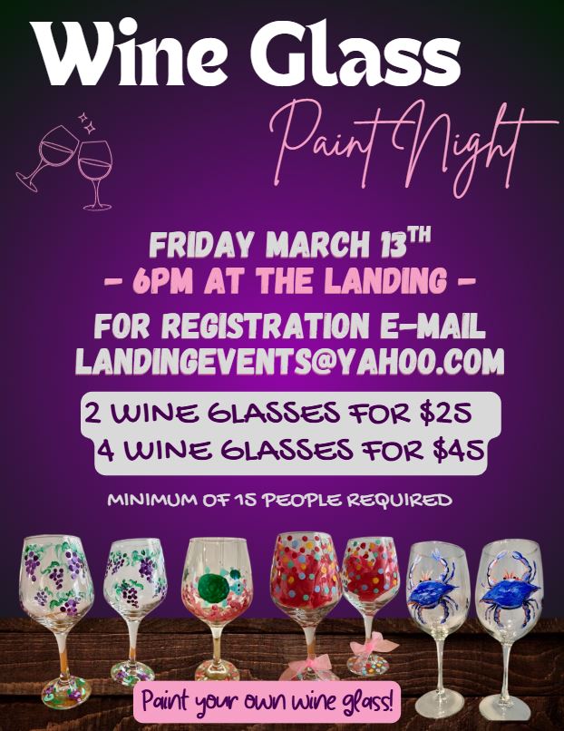Join us at The Landing for a creative and relaxing Paint Night where guests will design and paint their own wine glasses. The evening is led by local art instructor Pam Orris, who will guide you step-by-step, making it fun and easy for all skill levels. Gather your friends, enjoy great food and drinks, and leave with a custom piece you’ll be proud to show off. Space is limited, so be sure to reserve your spot for this unique and memorable night out.