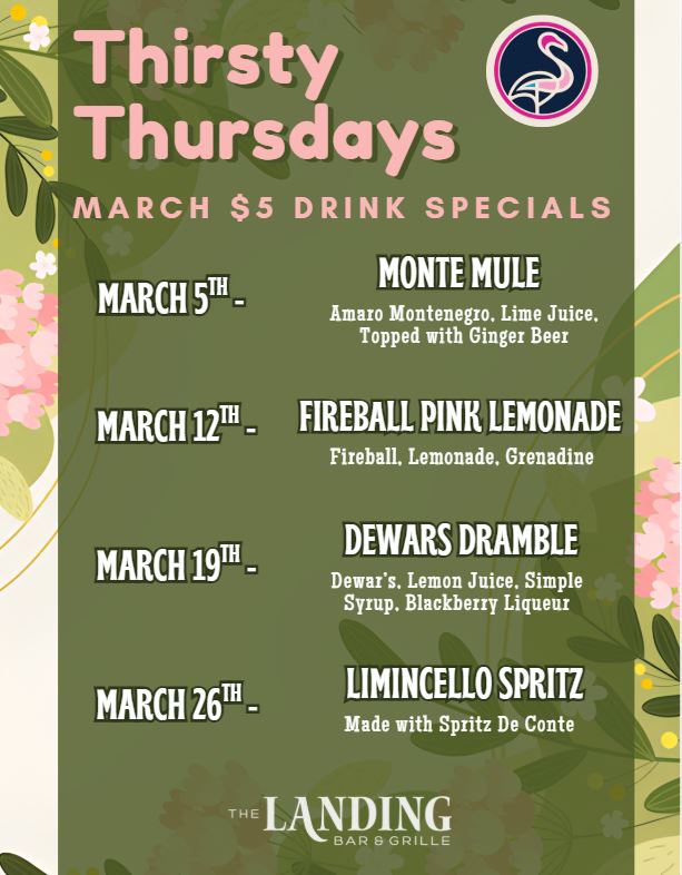 Thirsty Thursday just got better at The Landing! Join us every Thursday and enjoy $5 mixed cocktails all night long. Whether you’re meeting friends after work or kicking off the weekend early, our handcrafted favorites are the perfect way to unwind without breaking the bank. Grab a seat, sip on something delicious, and make The Landing your go-to spot every Thursday!